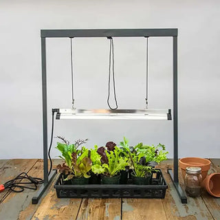 The T5 lamp seed starting lights provide a full light spectrum to help seedlings grow faster and develop stronger roots. Light source can be adjusted from 4-in. to 30-in. The Grow light is perfect for use with Gurney's Seed Starting Kit. The grow light system includes a sturdy metal stand, light fixture, and one full-spectrum fluorescent bulb.