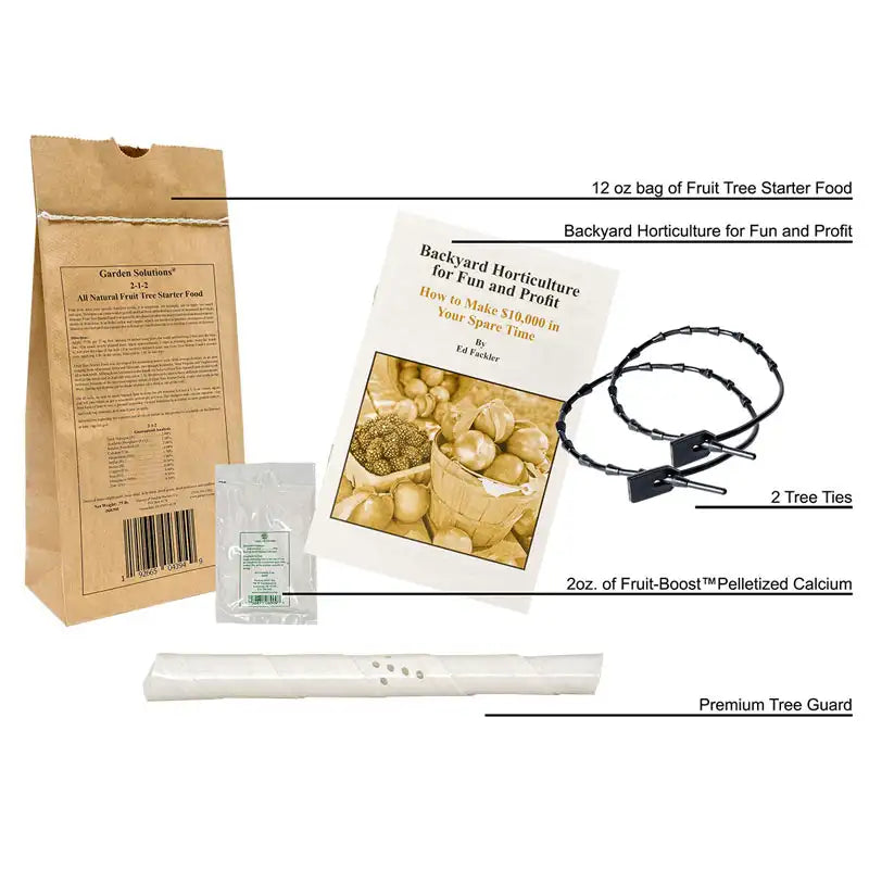 Why buy a Deluxe package - Deluxe fruit trees include 2 oz. of Fruit-Boost™ Pelletized Calcium to enhance fruit quality, 12 oz. bag of Fruit Tree Food Starter Formula, easy-to-use tree ties (see video below), a premium tree guard to protect the trunk from gnawing pests, mowers and weed trimmers.